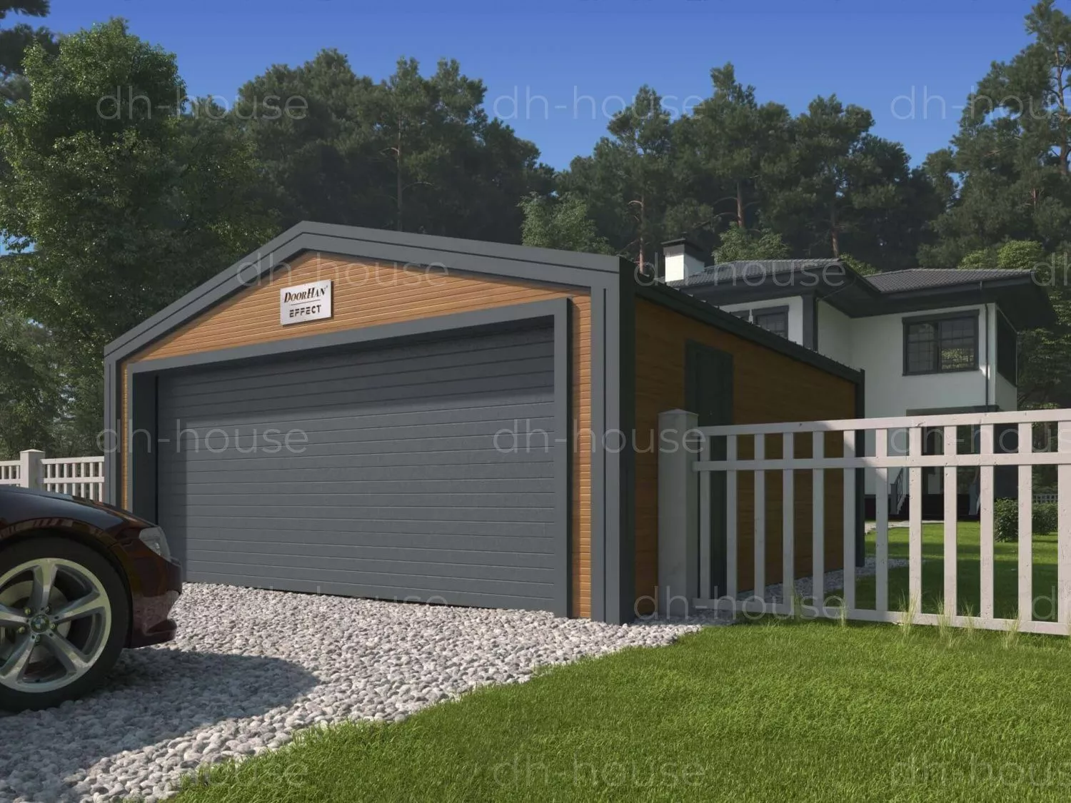 Гараж серии DoorHan представляет собой двускатное строение для стоянки автомобиля в Саратове. Выполнен в виде прямоугольной конструкции. Несущую функцию выполняет металлический каркас, собранный из профиля С-образной формы с оцинкованной поверхностью. Для обшивки кровли и стен выбраны ПИР-панели. Цвета внешних стеновых панелей — золотой дуб, кровельных уличных панелей — RAL 7016, стен и кровли внутри — RAL 9003.